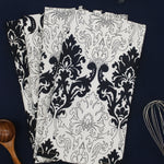 These gloves feature a damask-style floral design in black and white on soft cotton with padded interiors for heat protection. Perfect for stylish cooking, baking, or serving. Reusable and easy to wash after use