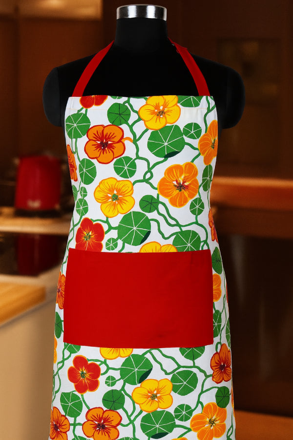 Buy cotton green and orange flower with red solid pocket free size apron online for cooking, baking, or daily kitchen use.