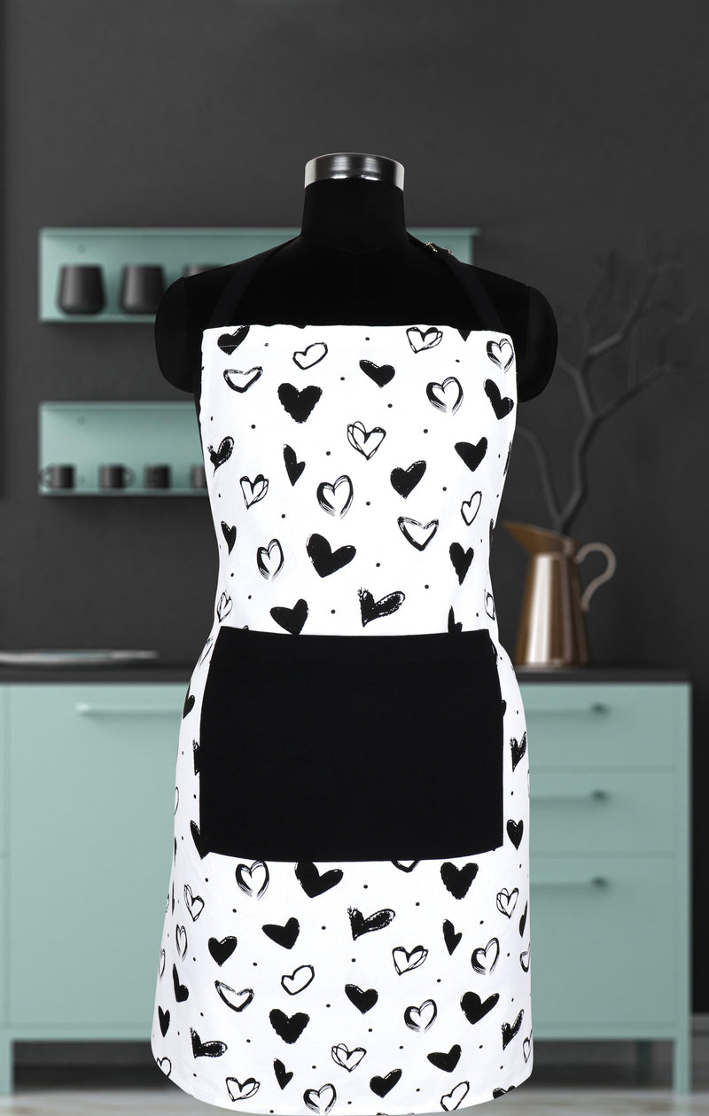 Made from 100% cotton, this apron features a charming black and white heart design with a solid pocket for added convenience. Lightweight and breathable, it keeps your clothes protected from stains and splashes. With adjustable back ties and machine washable fabric, it's a great addition to your daily kitchen essentials.