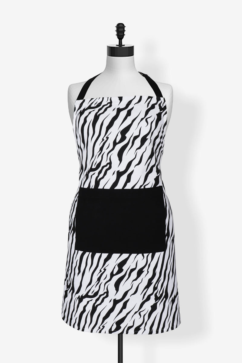 Made from 100% cotton, this apron features a bold black and white tiger stripe pattern with a solid pocket for everyday convenience. Lightweight and breathable, it protects your clothes from stains and spills. Adjustable back ties and machine washable fabric make it a great choice for regular use at home or work.