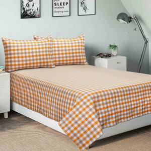 Cotton Checkered Bedsheet with Pillow Covers (Yellow, Beige)