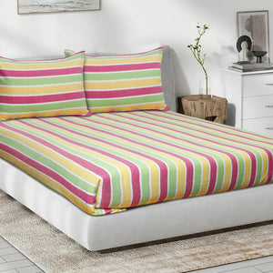 Cotton Designer Striped Bedsheet with Pillow Covers (Pink, Yellow, Green)