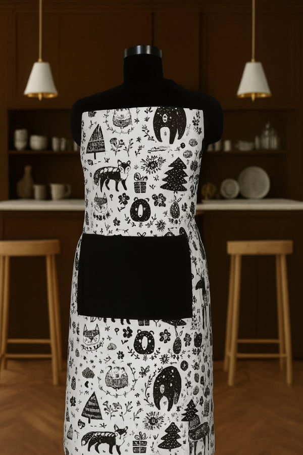 Made from 100% cotton, this apron features a playful black and white wild animal print along with a practical solid pocket. Lightweight and breathable, it offers comfort and protection while cooking or cleaning. With adjustable back ties and machine washable fabric, it’s perfect for daily use.