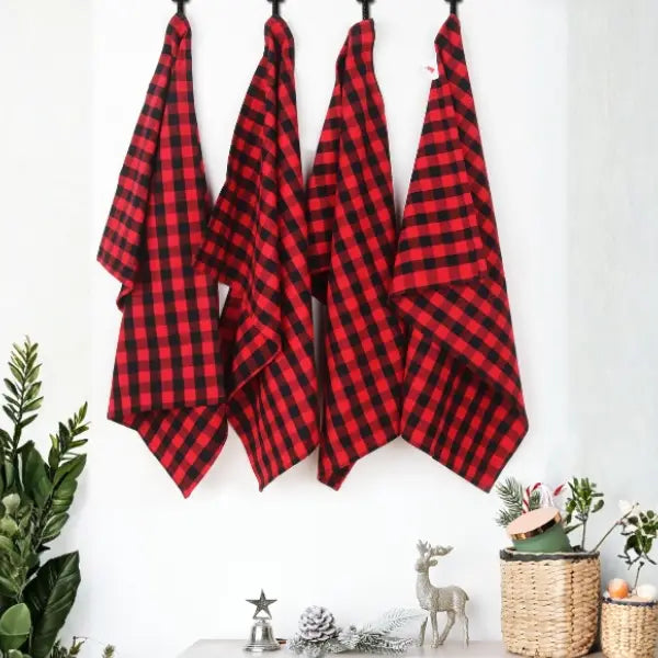 These towels feature a Black with Red Christmas-themed check pattern made from soft cotton, ideal for baking or festive decor. Reusable, absorbent, and machine washable for easy seasonal use.